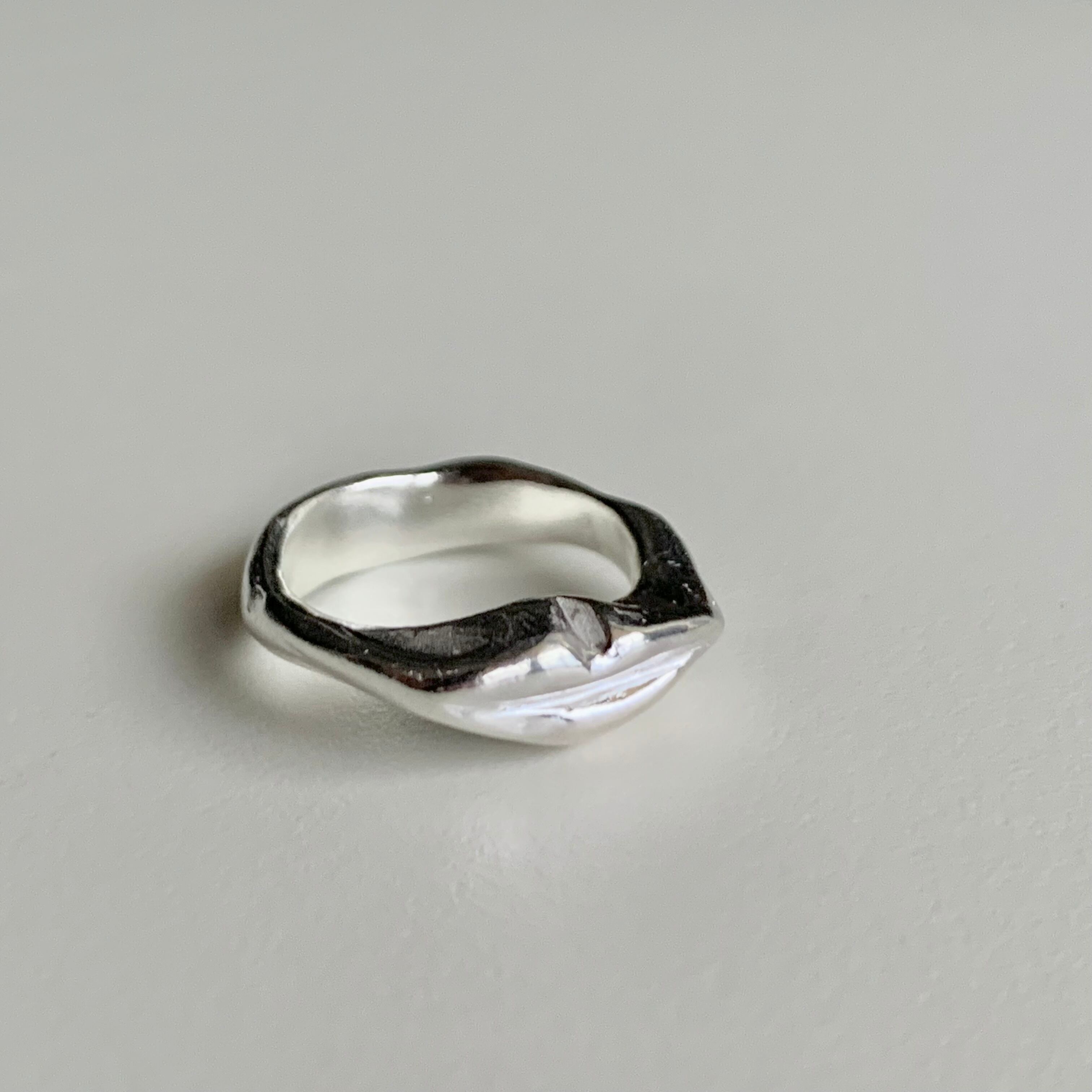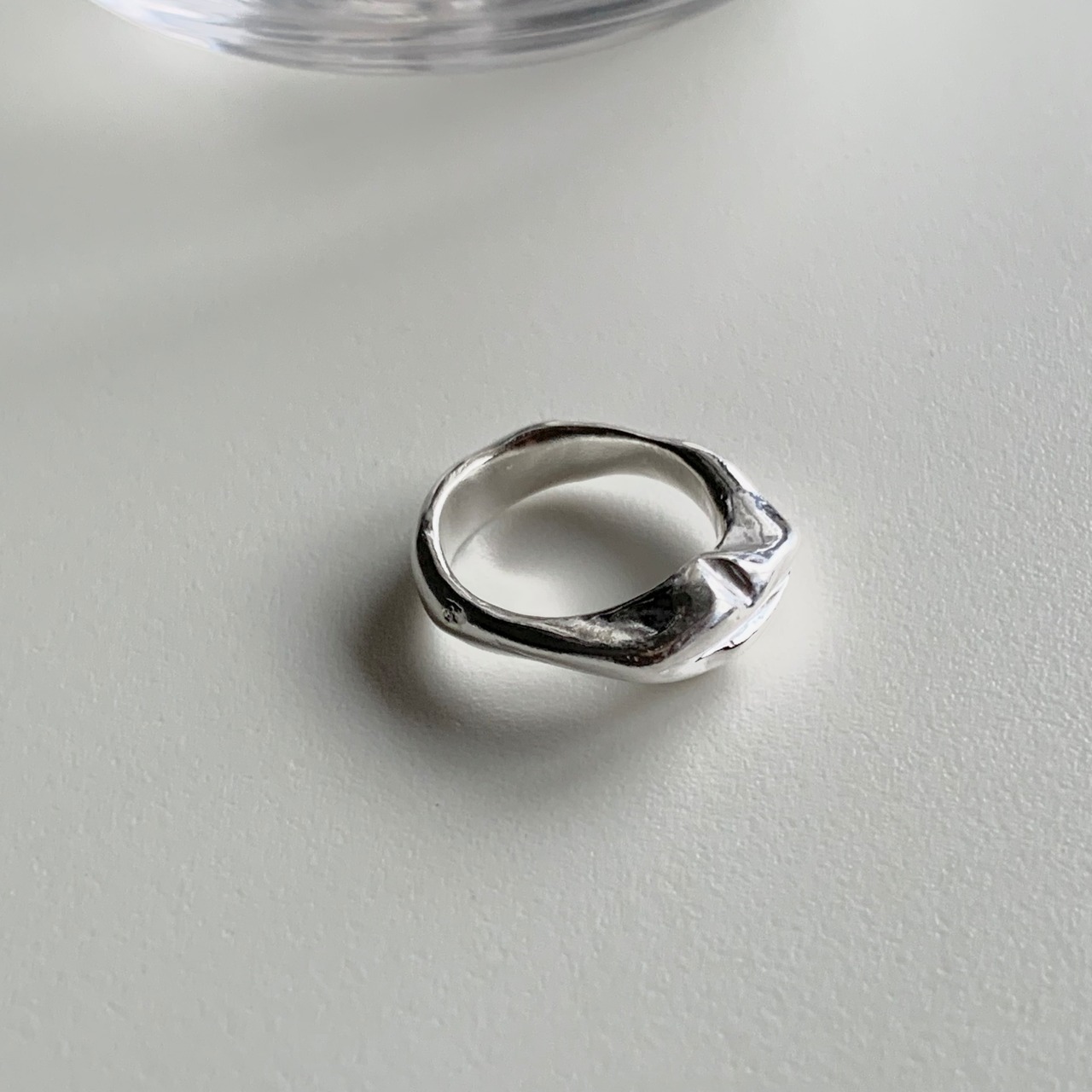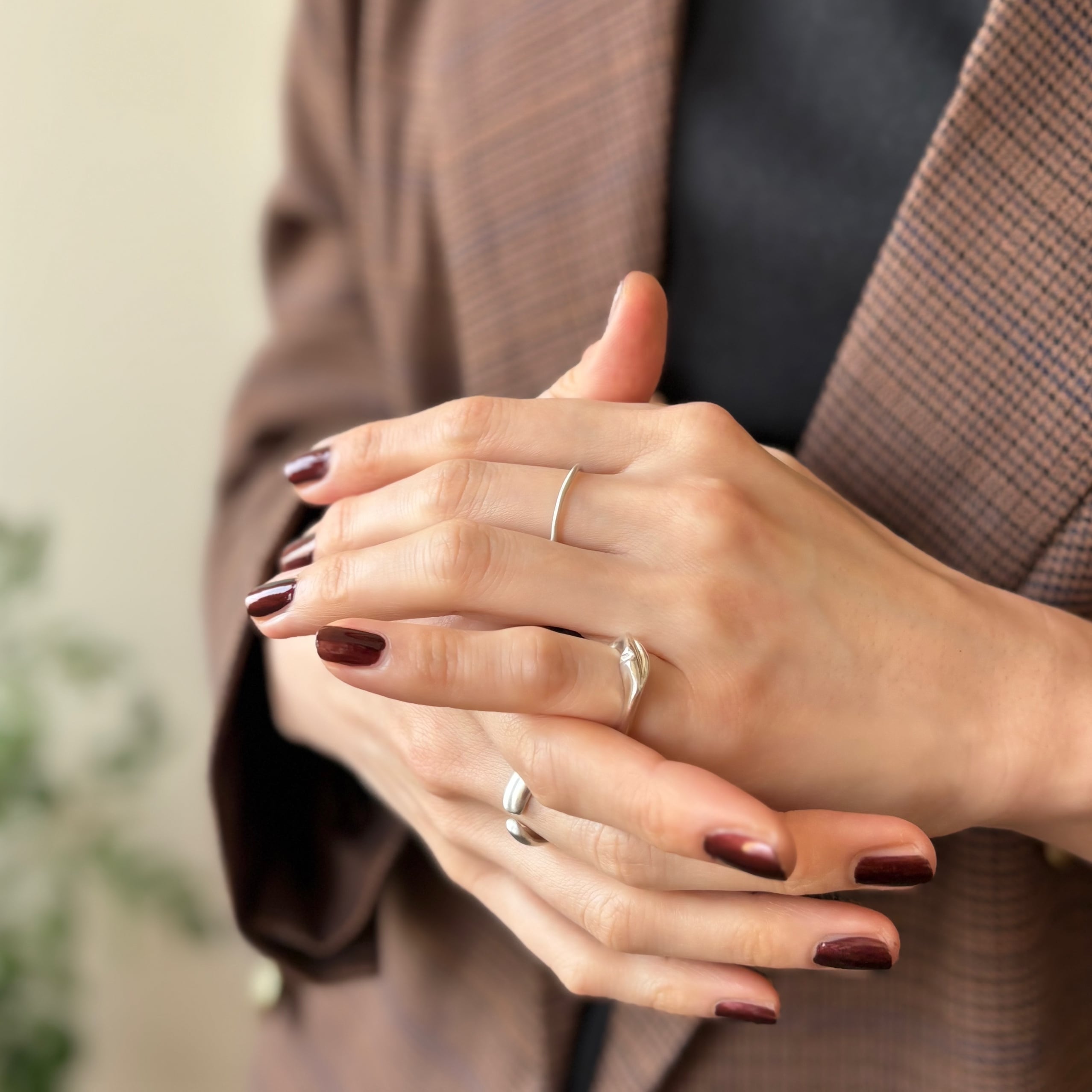 シルバーリングは硬派なアクセサリーのイメージもありますが、silver925の少し白みがかったシルバーカラーは肌馴染みがよく、重量感のあるリングも柔らかい印象でご着用いただけます。